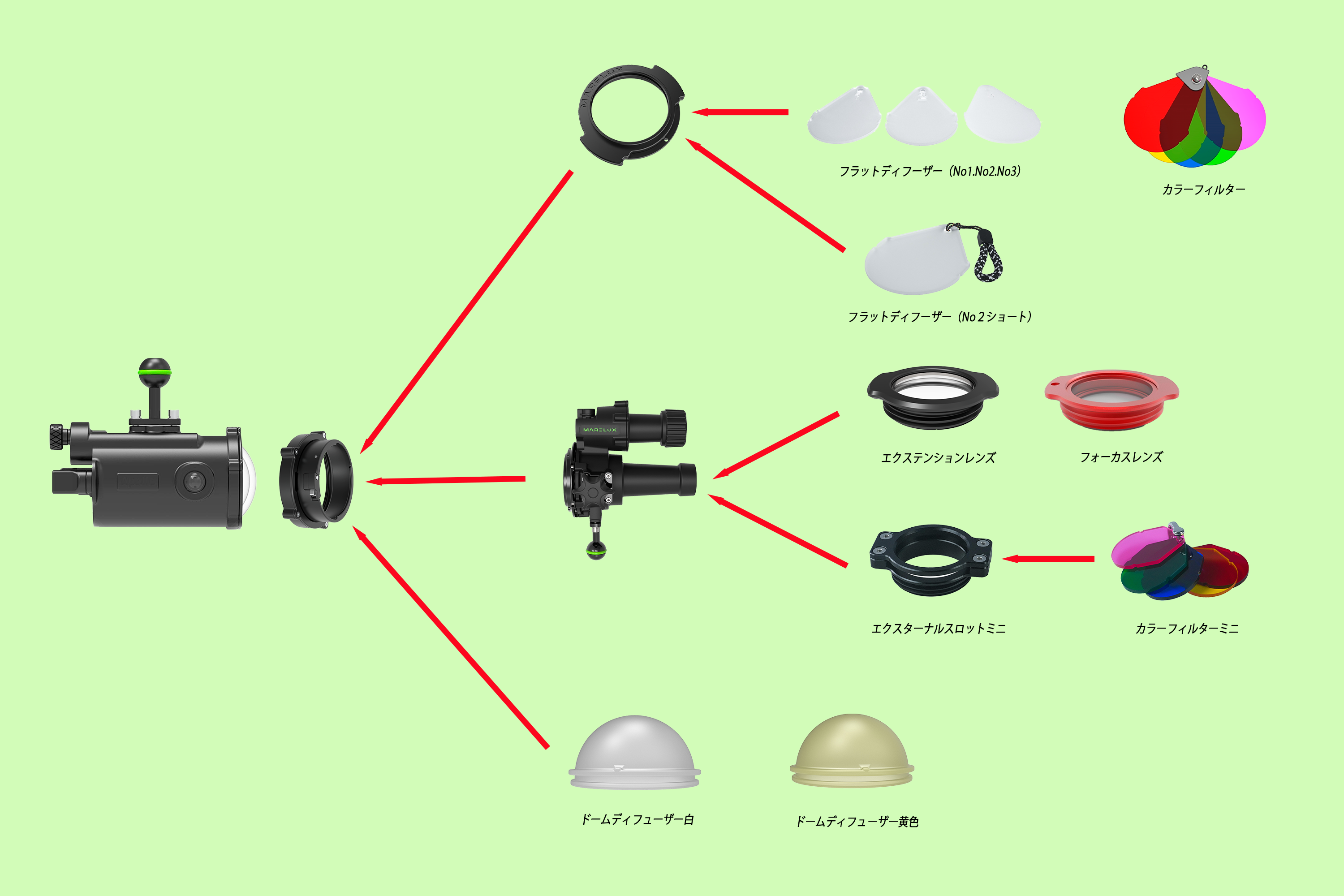 | フラットディフーザー(No1/No2/No3) | カラーフィルター | フラットディフーザー(No2ショート) | エクスターナルスロット |