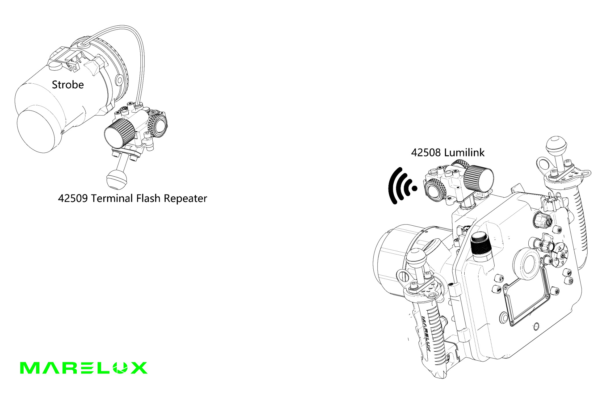 | Mareluxストロボ Apolloをワイヤレスで発光させるための製品です。 ハウジングの光ファイバーポートに取り付けるか、光ファイバーでハウジングと接続します。 ルミリンクはフラッシュトリガーから受信した信号を増幅・暗号化し、それを光信号として発信しMareluxストロボ Apolloが受信し発光します。 浅瀬のような明るい場所では約2m、深場のような薄暗い場所では10m以上伝送できます。ルミリンクは160°の発光角度を持ち、Apolloは160°の受信角度を持ちます。 | ||